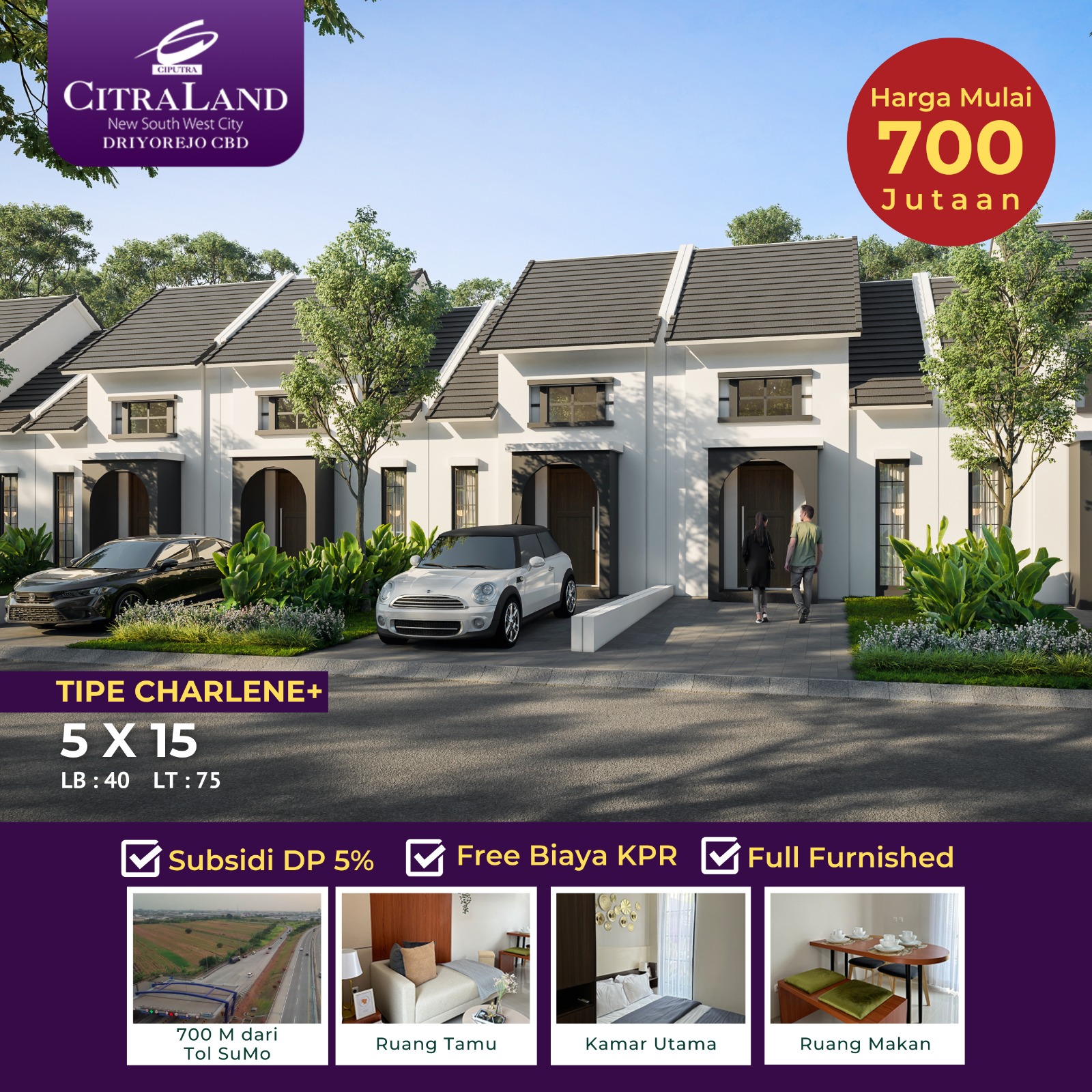 Harga Terbaik! Type Charlene+ dengan lokasi terdekat dengan fasilitas dan commercial area. Cukup dengan 700jt Anda bisa miliki rumah minimalis dengan ukuran 5 x15. Nikmati selangkah menuju Tol, yang mempermudah mobilitas Anda.